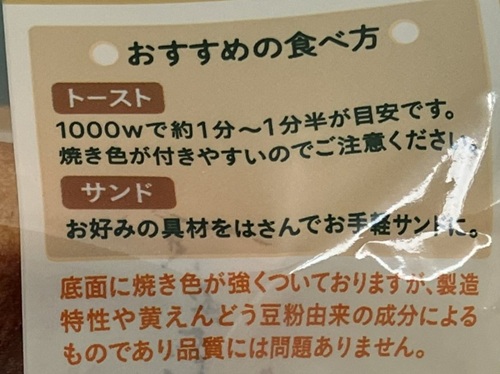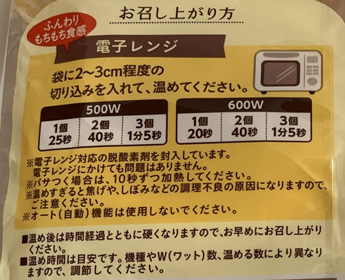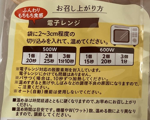 パッケージの裏面には、電子レンジを使った食べ方が書いてありす。玄米丸パンより少し短めの時間設定になっています。