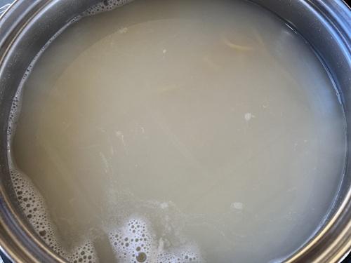 こちらが11分ゆでて火を止めたところです。小麦のパスタと比べると、ゆで湯に濁りが出やすいみたいです。