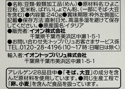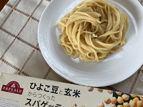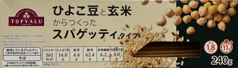 イオントップバリュのグルテンフリーパスタは、ひよこ豆、玄米、ばれいしょでん粉を使用しています。