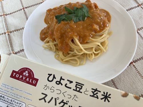 今回は、同じく「やさしいごはん」の棚に置いてあった、トップバリュのグルテンフリーパスタソースを使いました。