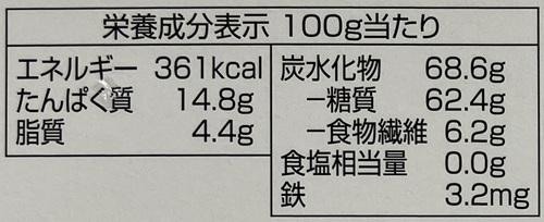 | 栄養成分表示 (100g当たり) | エネルギー:361kcal タンパク質:14.8g 脂質:4.4g 炭水化物:68.6g 食塩相当量:0.0g |