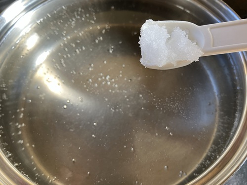 水を沸騰させてから塩を加えます。目安は水1リットルに対して塩10gです。小さじ1杯分の塩を入れるのが、美味しく仕上げるポイントです。