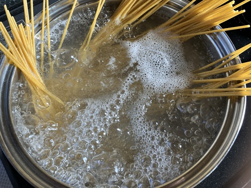 沸騰したお湯にパスタを入れます。麺はポキポキと折れることなく、小麦のパスタと同じ感覚で鍋に入れることができます。