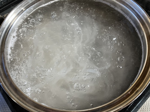 多めのお湯でゆでたので、ゆで湯のにごりは少ないように思いました。