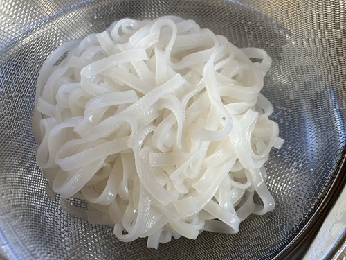 こちらが水気を切って、お皿に盛りつけたところです。一般のビーフンにくらべて、太めで平打ちなのが特徴です。