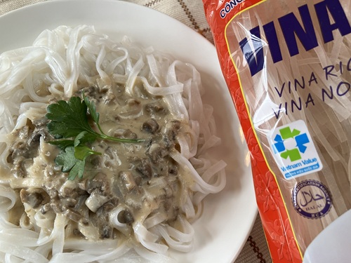 業務スーパーのライスヌードルは、太めでもちもちとした食感なので、平打ちパスタの「フィットチーネ」のように味わうことができました。