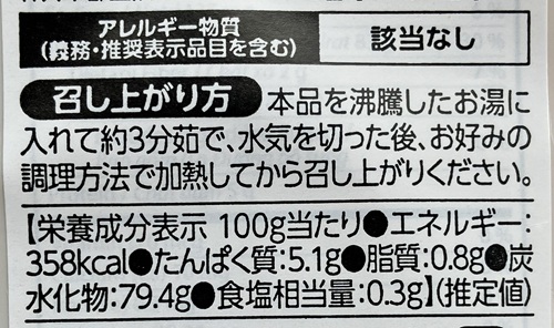 時間どおりに3分ゆでて、水気を切ったところです。ゆで上げた時はベタつきもなく、ほぐれやすかったので、水洗いはしませんでした。