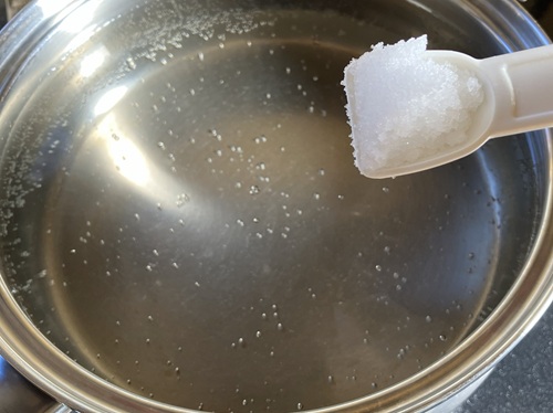 水を沸騰させて塩を加えます。目安は水1リットルに対して塩10gです。小さじ1杯程度の塩を入れるのが、美味しく仕上げるポイントです。