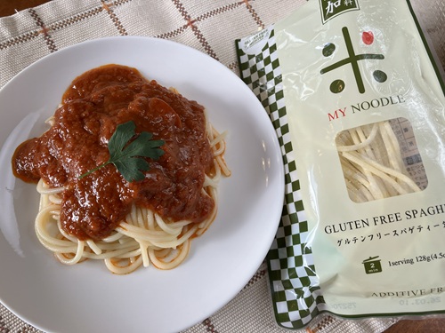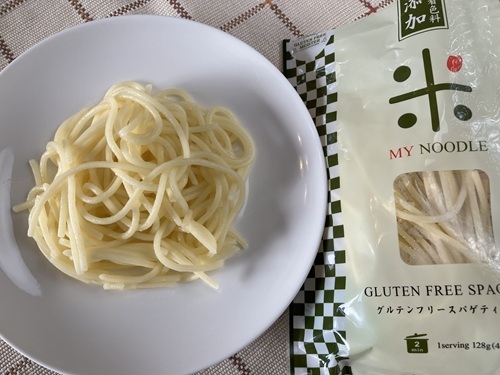 米粉でできたパスタは、表面のヌメリが少し気になります。麺がくっつかないように、汁気の多い食べ方にあわせるのがポイントだなと思いました。