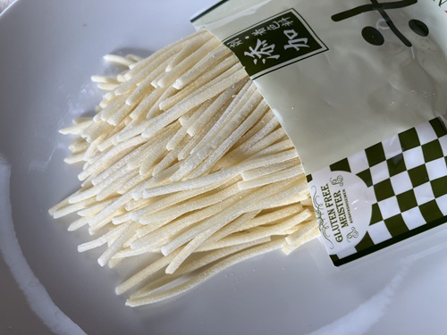 小林生麺のグルテンフリーパスタは、米粉(愛知県産)を使用し、馬鈴薯でん粉、とうもろこし粉末(遺伝子組み換えでない)をあわせた配合です。